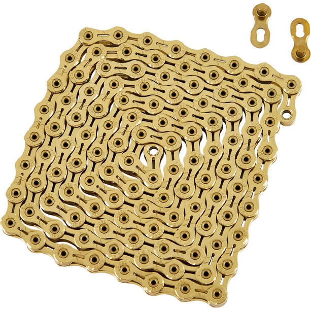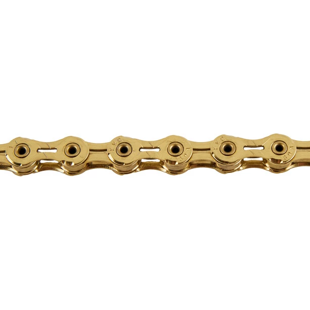 Chaîne KMC X-10-SL TI-N (10 vitesses) pour Shimano, Campagnolo et SRAM. Équipée de maillons de chaîne fraisés. Fabriquée en nitrure de titane ultra-léger, résistant et enduit de nitrure d’or.