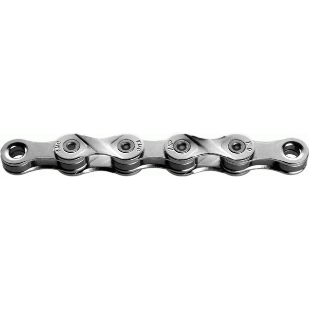 La chaîne KMC X9 est compatible avec tous les systèmes Shimano, Campagnolo et SRAM 9 vitesses. Il a une surface nickelée et n’est pas directionnel.