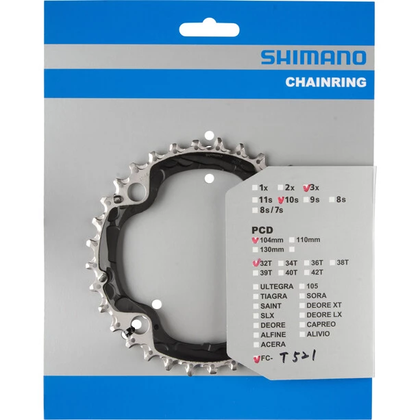 Les plateaux Shimano Trekking FC-T521 avec entraxe des trous de 104 mm conviennent aux pédaliers à 3 vitesse des vélos de ville et de randonnée avec la 10e cassette.